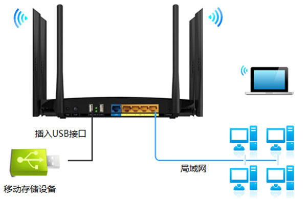 开启方法将移动存储设备(U盘、移动硬盘)连接在路由器的USB接口,且确保路由器上对应的USB指示灯亮,说明移动存储设备连接正常。