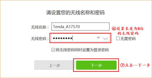 设置无线名称和密码,无线密码最短长度为8位,输入完成后点击下一步。