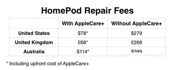 这样看来,维修价格几乎达到了售价的80%左右,你要知道HomePod的售价在这三个国家分别为美国349美元、英国319英镑、澳大利亚499澳元。