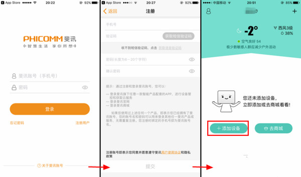 通过手机号进行账号的注册,注册后这个也就成了所有斐讯产品的账号,进入软件内,这是APP已经获取了你的位置信息,在界面上显示出你所再城市的空气质量以及天气信息,下步点击【添加设备】