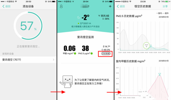 app会搜索到斐讯悟空M1,选择后添加完成,此后设备在网,就会持续记录空气质量信息(没有网络的话,是没有历史数据的)