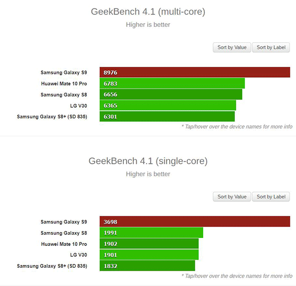 三星Exynos9810处理器跑分多少首先是国外主流跑分软件GeekBench的情况,Exynos 9810版S9在GeekBench 4.1上跑出了单核3698分,多核8976的高分。显而易见,无论是单核还是多核得分,Exynos 9810版S9轻松胜过目前安卓阵营中的其他手机。