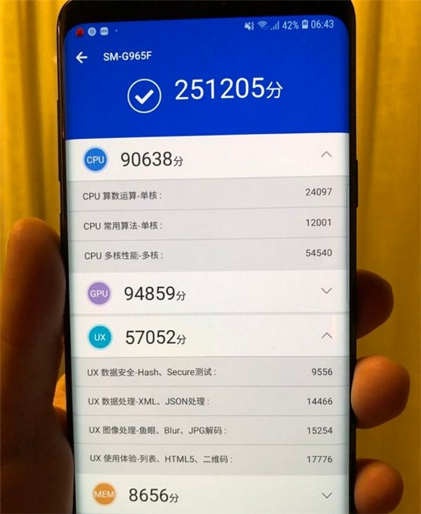 接下来是国内朋友更为熟悉的安兔兔平台。在安兔兔跑分中,Exynos9810版S9的得分为251205,要比搭载骁龙845处理器的小米MIX2s的分数要落后接近8%。