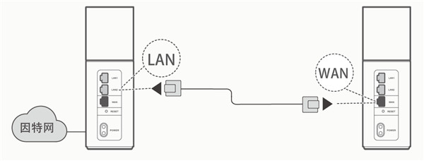 首先需要把主路由配置完成,也就是可以成功上网,然后用网线连接主路由的灰色网口(LAN 接口)和副路由的蓝色网口(WAN 接口)。