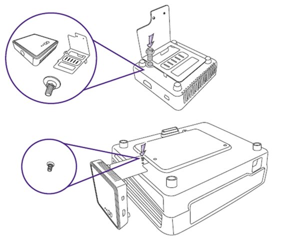 2、固定接收器到投影机(W1070+、W1080ST+、W1350、HT1075或1085ST,请用L型支架将接收器安装到投影机的右侧。用原装的固定器将安装支架一侧固定到接收器底部的三脚架孔,然后将安装支架的另一侧固定到投影机底部);