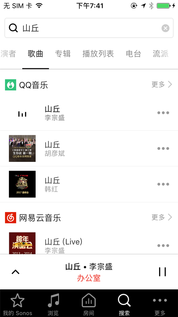 在SONOS的系统里,你搜索一个歌手,系统会在全世界的音乐服务商里面检索,这个时候无论是周杰伦还是李宗盛都能在平台里面搜到。目前,Sonos App 已经支持众多国内外主流音乐服务,从QQ音乐,虾米音乐,网易云音乐,到喜马拉雅FM等等等等。