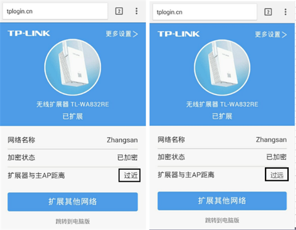 进入扩展器的管理界面,可以看到具体太近或太远的提示。