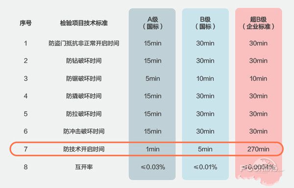 目前超B级锁芯防技术开启时间达到270分钟,而A、B级的数值分别为1分钟、5分钟,所以如果要买智能锁,必须选择配备超B级锁芯的产品。