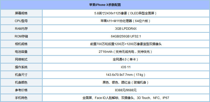 首先,买iPhone X前需要对苹果X价格、外观、配置做一个大致的了解,下面小编首先附上iPhone X详细参数配置,如下。