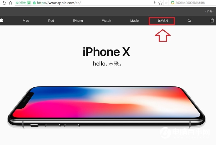 2、打开苹果中国官网之后,点击页面顶部导航中的「技术支持」,如图所示: