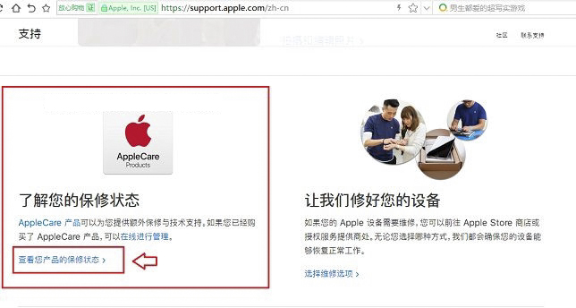 在技术支持页面下拉找到「AppleCare」服务选项,然后点击下方的「查看您的保修状态」如下图所示。