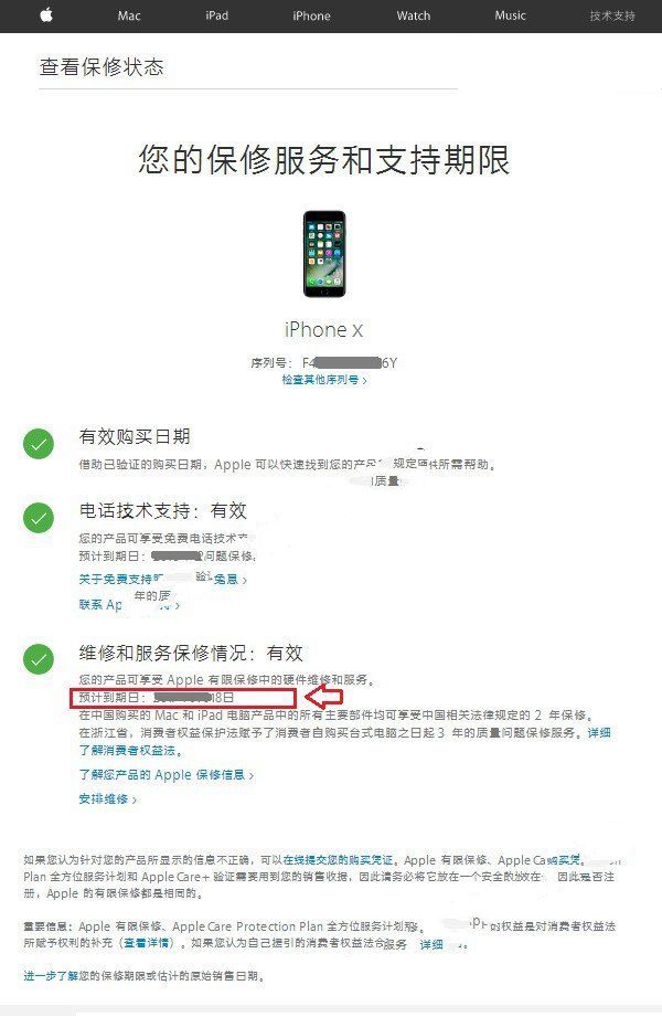 最后就可以查询到iPhone X的维修和服务保修情况、电话技术支持等信息,如图所示。