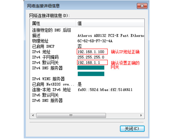 确认服务器网络参数设置正确(IP地址、子网掩码、默认网关),在网络连接的属性可以查看到。