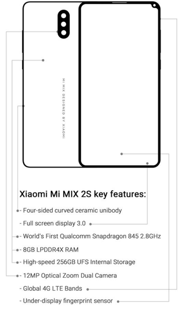 主要参数方面,小米MIX 2S将搭载骁龙845芯片,主频2.8GHz,8GB LPDDR4X运行内存,256GB UFS闪存,后置1200万像素双摄像头,可光学变焦。