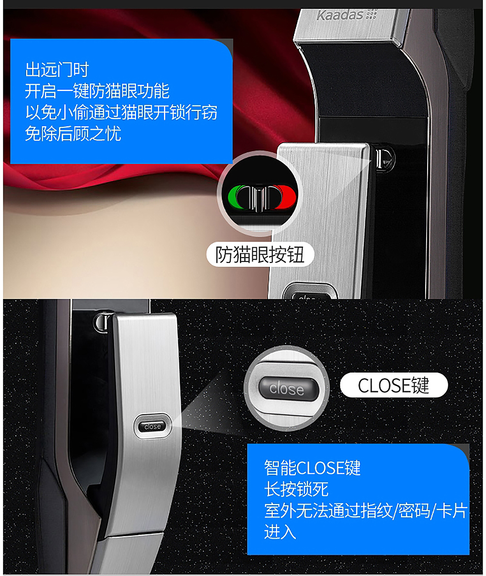 当你不在家的时候,你还能打开红色开关防猫眼(可理解为小锁,锁上以后内侧无法推动门把手),小偷就无法通过猫眼来开锁。