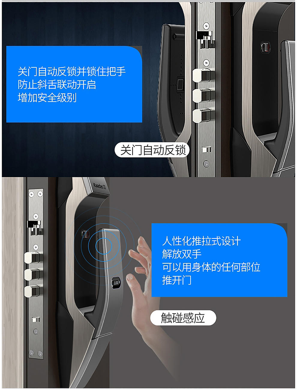 凯迪仕K7拥有3个大锁舌,1个小锁舌,和最上面一个防卡片开门的锁舌,关门自动上锁并锁住把手,非常安全。