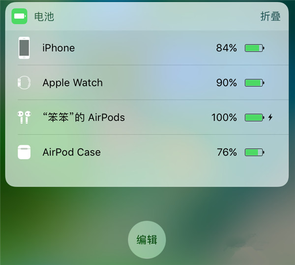 在通知中心的今天功能栏目中,也能看到当前连接的 AirPods 蓝牙电量,如图所示: