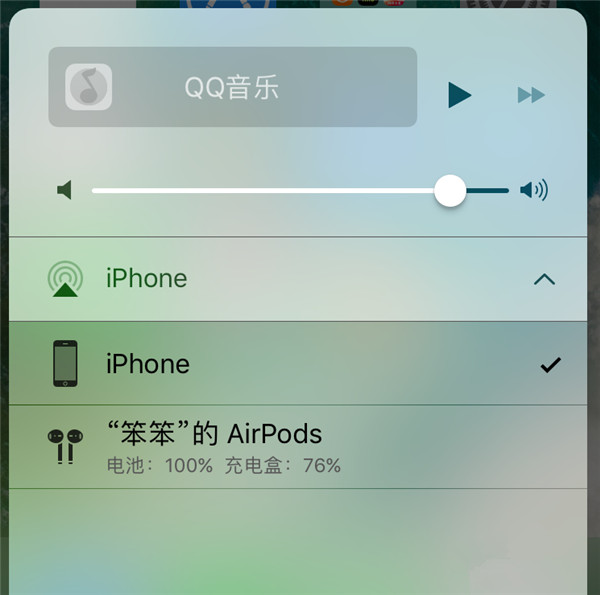 还可以通过控制中心下方的音频设备,查看 AirPods 的电量,如图所示: