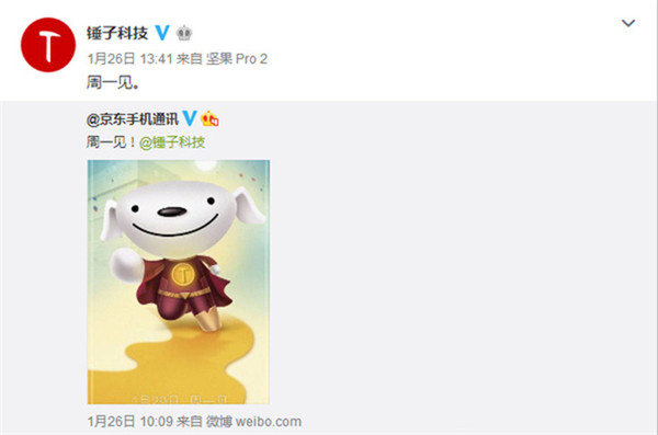 坚果Pro2白色版什么时候上市1月26日,京东手机通讯官方微博预告,将于1月29日宣布一项重要消息。当天下午,锤子科技转发了该条微博并以“周一见”三个字予以回复。