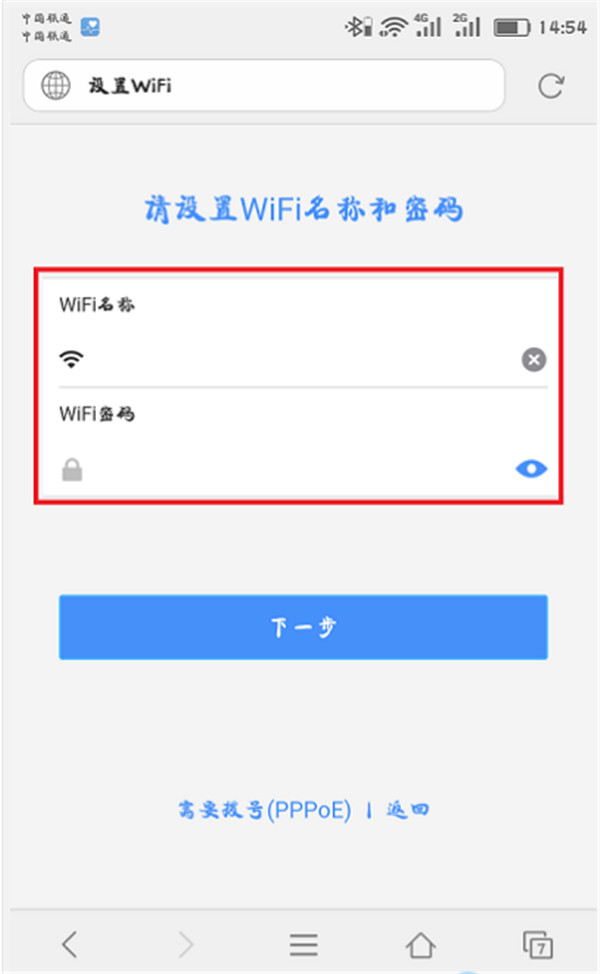 设置“WiFi名称”、“WiFi密码”——>点击“下一步”。