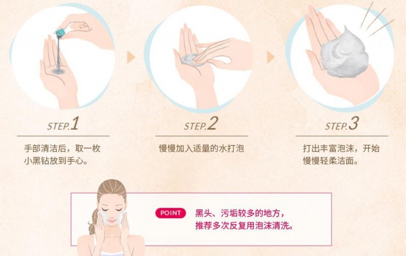 使用洁面粉时,无论如何一定要先让洁面粉在手心与水混合充分起泡后再洗脸,这样能够避免界面活性剂直接接触肌肤,造成皮肤不适的可能。产品成分中最常见的酵素是一种酶,主要作用新陈代谢作用;玉米淀粉 有促进细胞分裂、延缓衰老;褐藻提取物具有养颜润肤、抗菌消炎和祛斑等功效。所以用手心和水混合后,让该溶解的成分先溶解,才是最有效的用法。