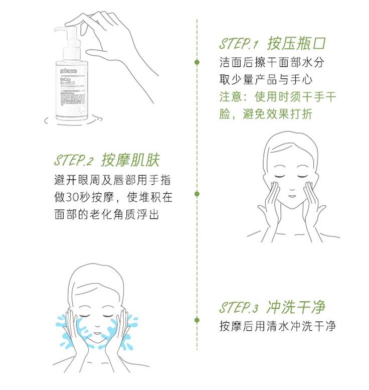 清洁完脸部后,擦干脸上的水分,然后按压泵头1~2下,避开眼周及唇部均匀涂抹于面部。用手指做30秒按摩后,堆积在面部的老化,角质浮出,用水清洗干净即可。建议一周使用1到2次,不需要天天使用。