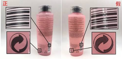 2、 瓶身印刷图案:粉水没有盒子塑封仅有一个超大礼盒粉水就躺在卡槽里,光溜溜一大瓶让辨别点变少许多但是还是能辨认出真假货区别真货条形码是哑光色而假货能反光那个回收的标志也能发光还出现墨迹太浅的现象但是真货却是磨砂而均匀的。