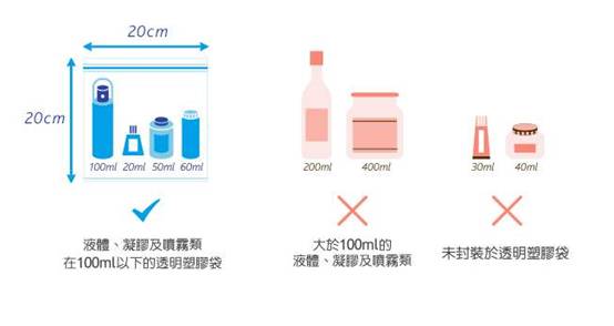 所有液体产品都需要装在1000ml容量的拉链透明袋中,每位乘客只能携带一个。