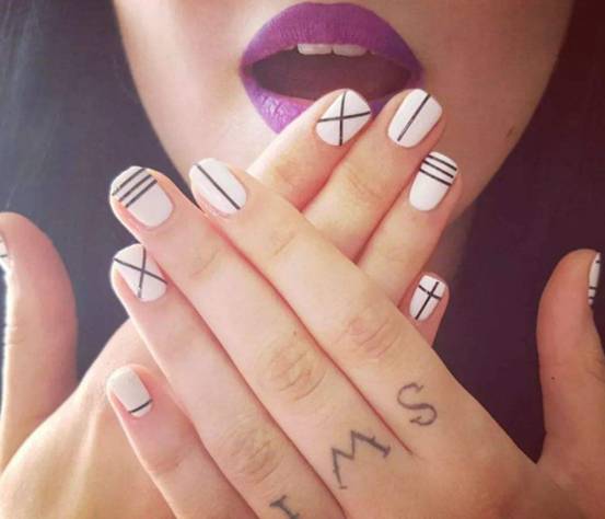 指甲可以涂成全白或者半白色,全白的指甲上面可以选则黑色的花纹或者字母,例如流行的大理石纹或者黑白指甲油之间相互渲染的抽象的纹路,又或者将自己喜欢的品牌的商标画在指甲上,也非常个性。