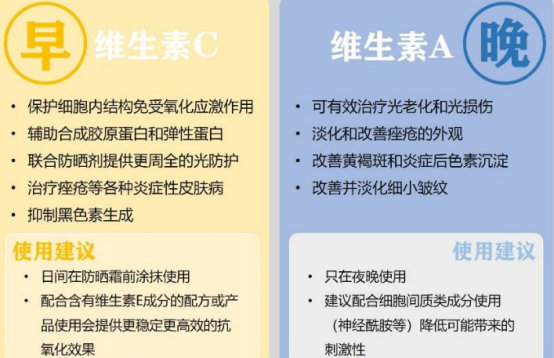 用VC的同时,一定要做好防晒,具有光敏性的是维A并不是维C,维C一定要在白天用,因为它可以辅助防晒,当然前提是做好防晒工作,要不然就得不偿失。