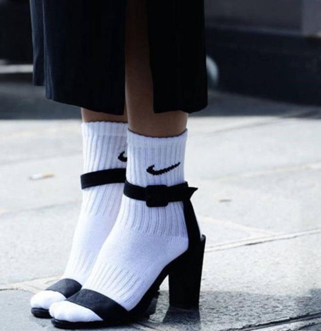 黑色马丁靴+黑色袜子 黑色马丁靴搭配黑色袜子,视觉上可以拉长靴子,在搭配裙子的时候,要是觉得鞋子不够长就可以这样搭配,还可以为整体造型增添层次感。