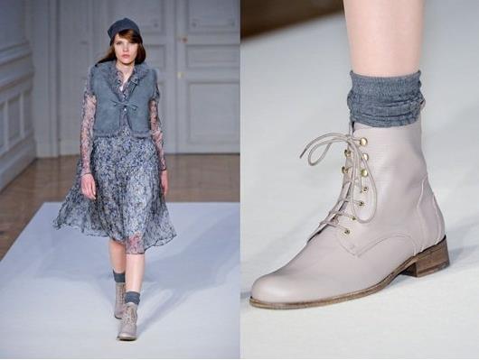 卡其色马丁靴+灰色长袜 卡其色马丁靴搭配灰色长袜,还可以把长袜拉出来拢在裤脚上。