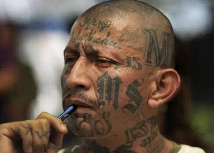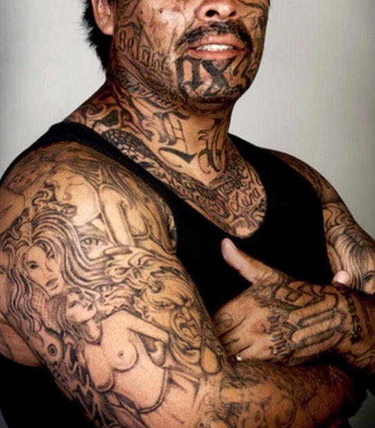 MS 13这个纹身有时也会单独以MS或者13单独出现,它是中美洲萨尔瓦多的救世鳟鱼帮的标志。通常来说,这个纹身可以出现在身体上的任何地方,但最常见于脸、手与脖子等显而易见的部位。洛杉矶的救世鳟鱼帮由洛杉矶地区的萨尔瓦多移民发起。现在,MS-13的分支已经遍布全美,并延伸至加拿大。他们的产业包括毒品交易及儿童卖淫。