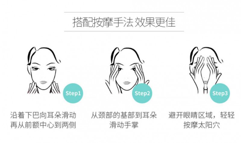 我们把取玻尿酸精华液几滴,滴在大拇指和食指之间,可能大家会问,为什么不是手心?那是因为手心温度太高,会快速吸收精华液中的养分。而虎口处皮肤温度刚好适中。之后,我们再用手指把玻尿酸精华液涂抹到面部或者脖子上。