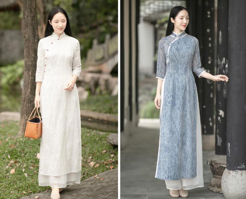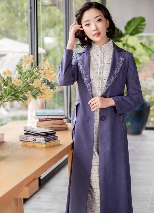 5. 白色绣花风衣+蓝色水墨旗袍