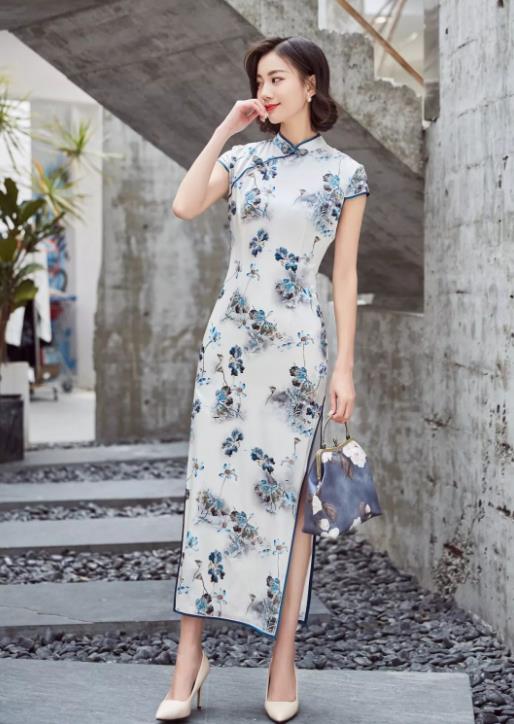 这款蓝色水墨风旗袍是非常典雅的,搭配一件白色绣花风衣,是一套非常具有中国风的搭配。