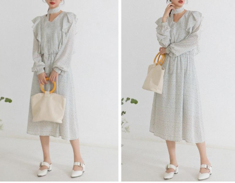 3. 碎花裙 春季流行哪些款式的连衣裙?不得不推荐这款碎花裙,超级吸睛养眼的款式,上身显得大气感,袖子立起的褶皱设计,显得特别有气场,腰间的抽绳造型,令设计细节感更加明显,小碎花的图案,看起来尽显青春复古感,身材也会显得更高挑!