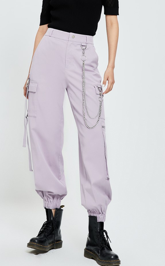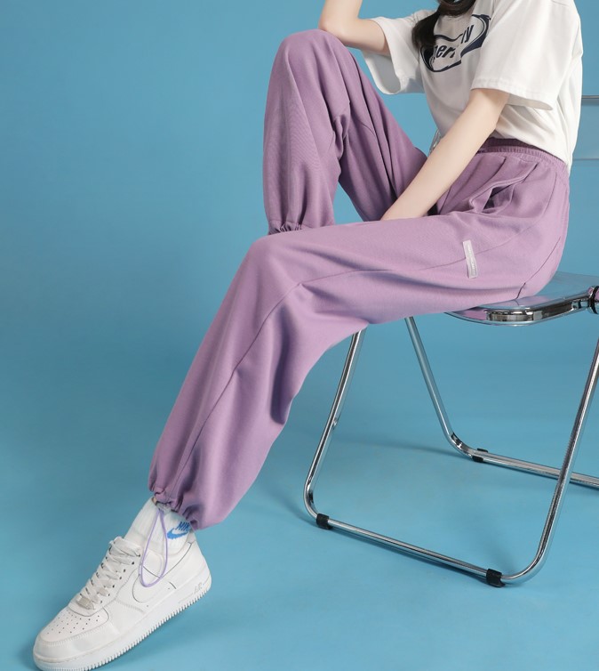 今年超级流行紫色紧口运动裤,这种裤子很好搭配的,黑色T恤就可以,不要紧身的,宽宽松松就非常好。