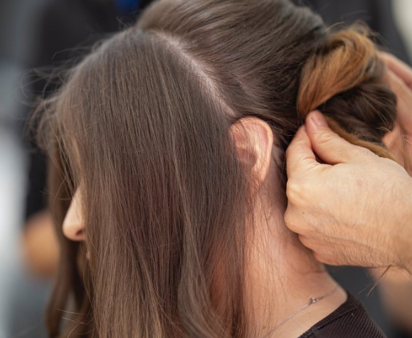 想让发髻看起来更紧实更有厚度的话,可以先把头发分成两段绑成3股辫,然后把3股辫子扭转绑在一起就好。如果想让发型看起来更为随性和慵懒,建议把头发烫一下。