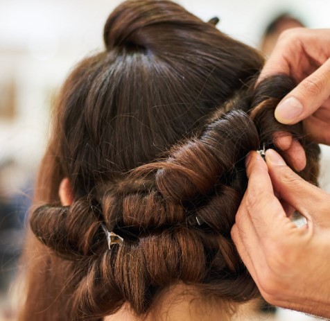 ⑦梳理好头发分为上下两部分,上部分两股辫编发,辫子节轻扯出小面积。