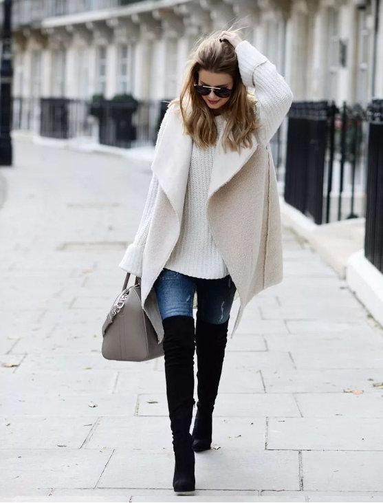 在天气比较冷的时候,可选择一些毛衣或者比较厚的宽松的上衣,这样还可以在里面搭配加绒打底衫,显得不臃肿但又达到保暖的效果了。裤子的搭配选择破洞牛仔裤非常适合,再加上一双过膝长靴整体看起来真的太时尚了,有种个性的范儿,还能使自己显高哦~