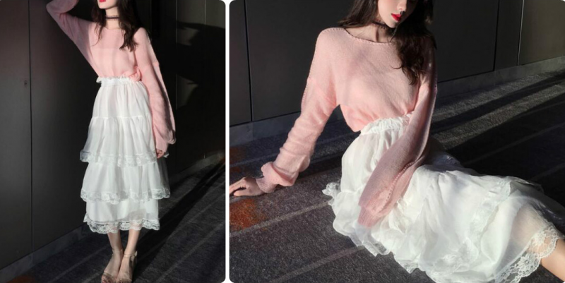 1. 蓝色外套+白色针织衫+粉色蕾丝半裙+粉色铆钉高跟