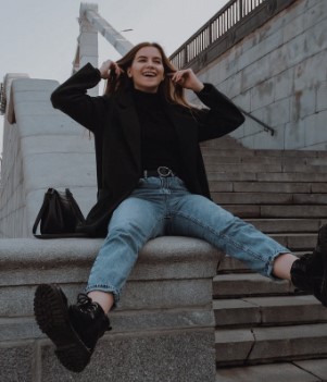 运动裤是很宽松、舒适的裤子,最近也非常流行,黑色牛仔外套搭配一件浅灰色连帽卫衣,下身搭配一条黑色运动裤,时尚又很显活力。