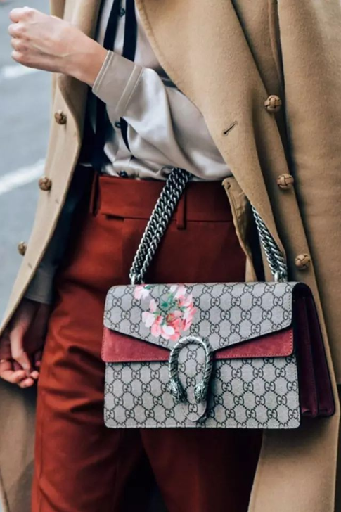 1. 辨认包包logo,真品Gucci的双GLOGO花纹织法非常整齐,可以清晰地看到两个大写字母G的图案。如果将Gucci包包在光线下慢慢转动,会看到双G标志随着灯光的折射而改变颜色,但冒牌货的双G标志不会变色。