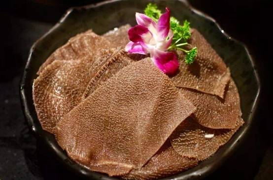 先用水泡上一天然后将毛肚上的杂物抖尽,摊于案板上,将肚叶层层里伸,再用清水反复清洗黑膜和草味,切去肚门的边沿,撕去底部(无肚叶的一面)的油皮,以一张大叶和一张小叶为一连,顺纹路切断,再将每连叶子理顺摊平,切成约1、5厘米宽的片,用凉水漂起。
