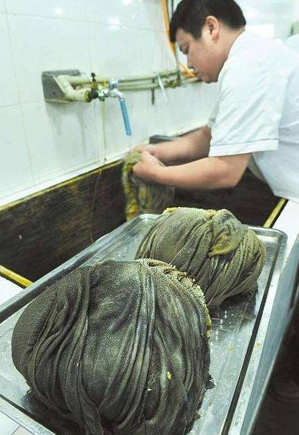 2、用苏打粉使劲的揉搓,揉搓好后放置1小时在用水冲洗干净后在用水泡30分钟,然后烧开水灼一下,怪味道就差不多没了,做的时候加料酒,姜,白糖都是调味的。