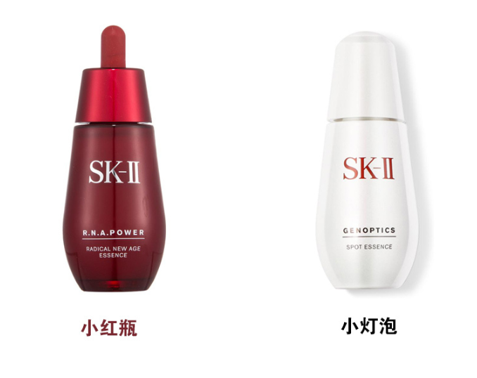 1. 小灯泡 全名:SK-II肌因光蕴环釆臻晳钻白精华露 功效:淡化痘印、提亮肤色,主打提亮肤色的功效,防止新的黑色素生成,瓶身是白色加镭射光晕,升级版乳白色乳液状,质地更滋润。