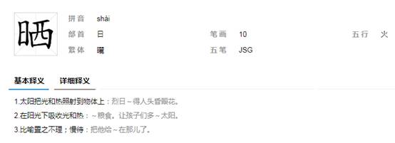 详细释义: (1) 晒,形声。左形,右声。本义:在阳光下曝干或取暖。