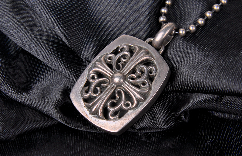 十字花图案是克罗心(Chrome Hearts)著名的银饰品牌,克罗心(Chrome Hearts)是来自美国的品牌。