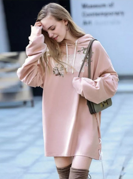 尤其对于身高不是很高的女生,这样的宽松卫衣搭配短裙是一种很友好的搭配,裙子的长度最好在膝盖以上,这样有拉高身长的感觉,同时会显得人更加较小可爱。